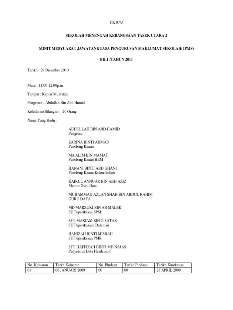 Mar 03 2015 contoh minit mesyuarat tmk. Bilik Pusat Sumber Kehadiran. MINIT MESYUARAT JAWATANKUASA INDUK PENTAKSIRAN BERASASKAN SEKOLAH PBS NEGERI JOHOR BIL.